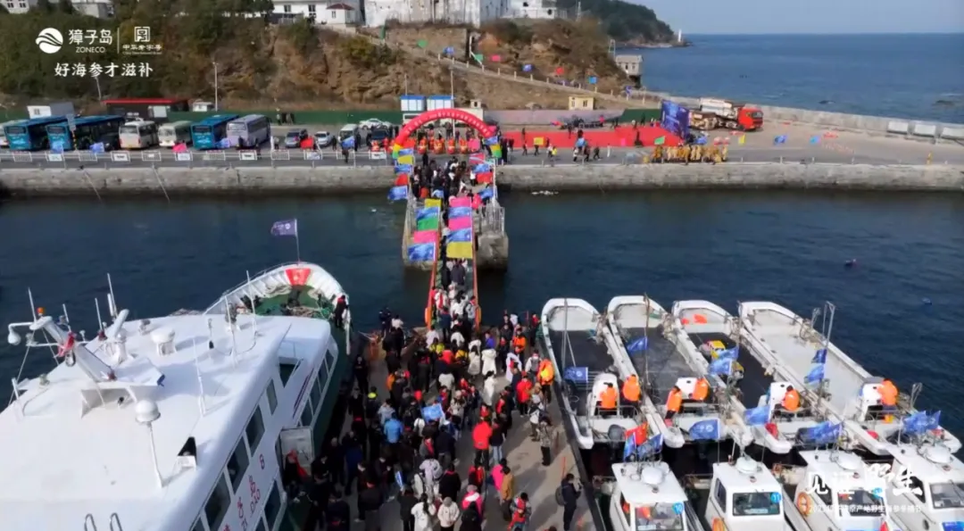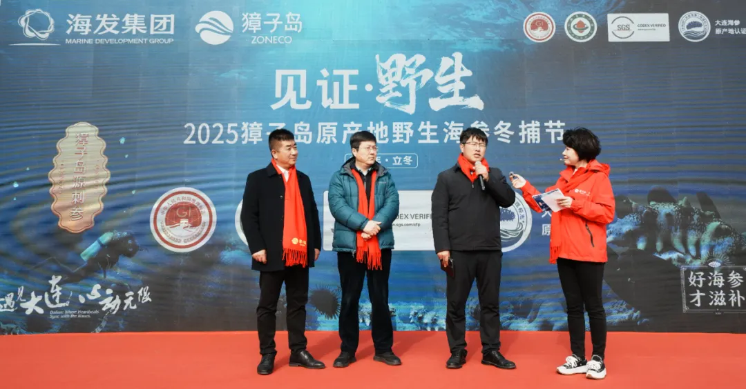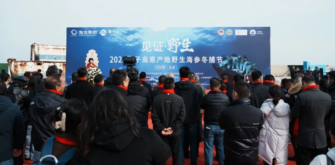 初冬时节,碧海欢歌。11月7日,正值“立冬”节气,在北纬39°黄金海域——辽宁大连长山群岛最南端的獐子岛镇,“见证·野生——2025獐子岛原产地野生海参冬捕节”正式启幕,现场锣鼓喧天,海腾人欢,洋溢着丰收的喜悦。大连獐子岛海洋发展集团总经理张昱,长海县委常委、副县长、獐子岛镇党委书记张盛族,大连市文化和旅游局副局长刘磊,中绿华夏有机产品认证中心主任栾治华,大连市现代农业生产发展服务中心副主任赵宇,通标标准技术服务有限公司大连分公司东北区农产食品部经理刘守峰,大连市海洋渔业协会会长李克诗,以及獐子岛集团总裁路珂等领导出席活动。来自全国各地的嘉宾、经销商伙伴、主流媒体代表及网红主播等300余人共同见证这一海洋盛事的开启。