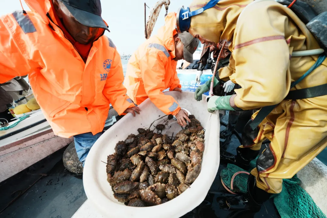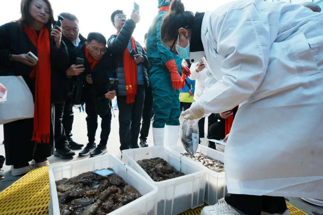 马牙滩海域位于獐子岛西北侧,是大连地区罕有的野生源刺参核心产区。近50名潜水员整理装备后倾身入海,约十分钟后相继浮出水面,每人手中满载着20余斤源刺参。船上工作人员立即进行现场分拣,并详细记录采捕时间、海域、船号、潜水员及海参数量等信息,为原产地二维码追溯体系提供精准数据支撑。