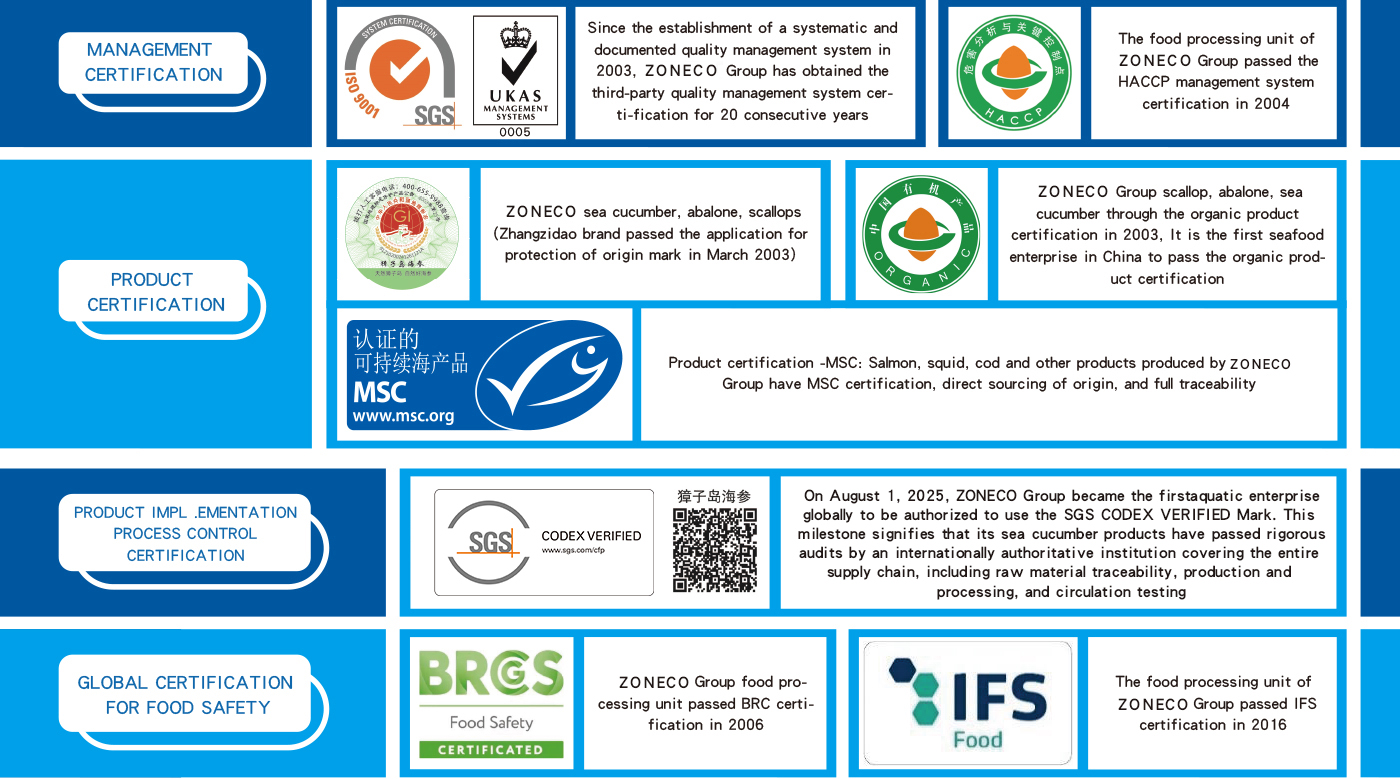 Zhangzi Island is located in the golden sea area of the North Yellow Sea at 39° north latitude, and has been praised as "a red flag in the depths of the Yellow Sea", "Yellow Sea pearl" and "Marine blue chip". With its unique resource advantages, Zoneco Group Co., LTD. has developed and listed its unique health food, such as sea cucumber, abalone, scallops, salmon, cod, squid, mackerel mackerel, shrimp, leisure food, prepared food, frozen fresh food, cold water live food, which is favored by consumers. Sales network throughout the country's major cities, and exports to the United States, Canada, Australia, Japan and other more than 20 countries and regions. "Zoneco" trademark is the first "China Famous trademark" in China's aquatic industry, and Zoneco brand has become "China's most influential aquatic brand" and has been identified as "China's Time-honored Brand".
